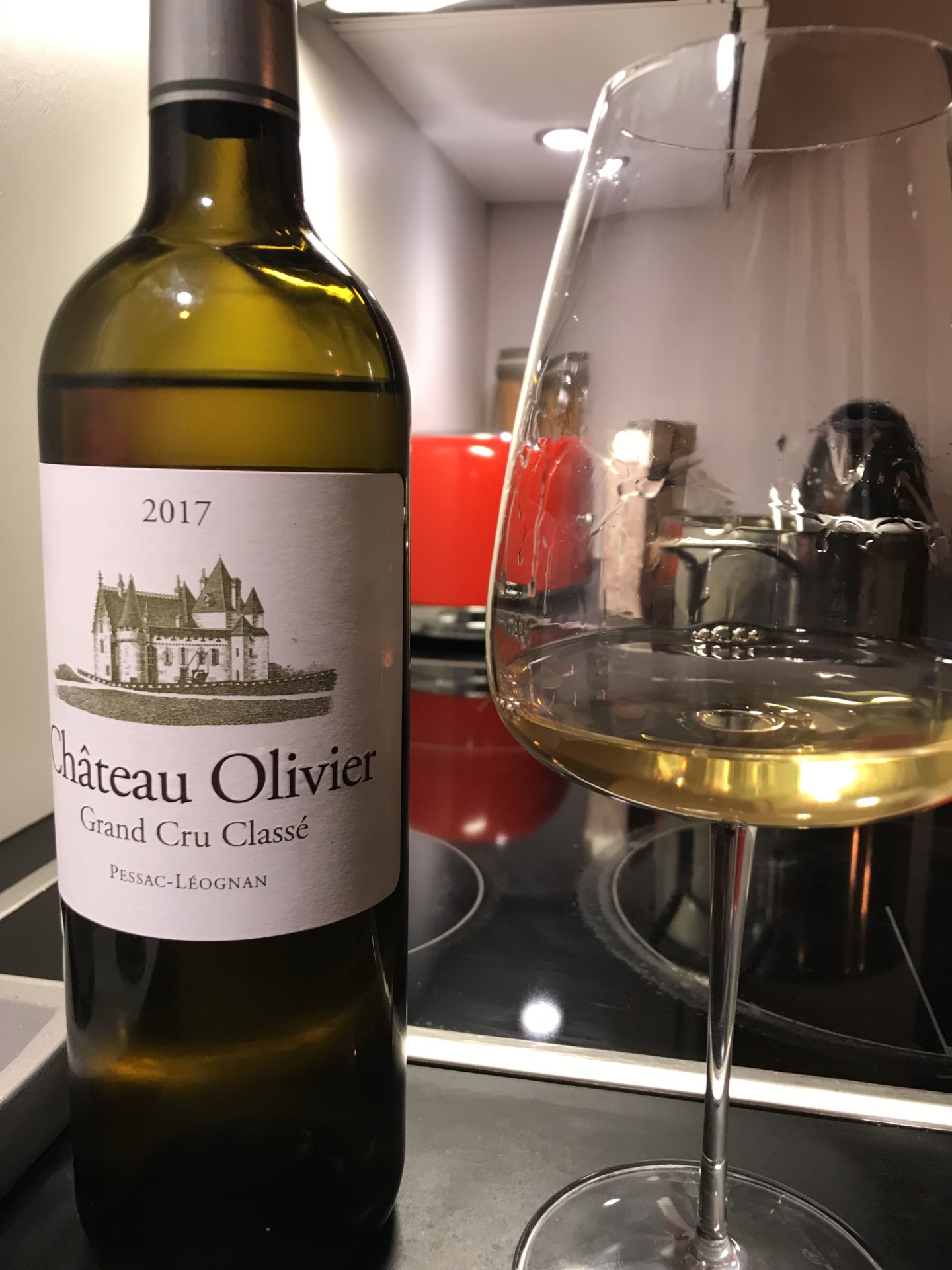 Og hvad drikker man til sådan en suppe? Ja, mit første forslag til enhver tid vil være “Hvid Bourgogne”. Men var det ikke på tide at prøve en anden fadlagret hvidvin til? Helt klart. Jeg fremdrog den flaske Château Olivier 2017 hvidvin fra den berømte Bordeaux-kommune Pessac-Léognan og nu skulle vi finde ud af om dét så fungerede- og om vinen var god..